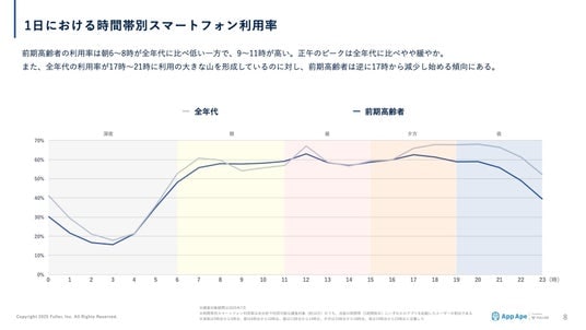 前期高齢者のスマートフォン利用率は朝6~8時が全年代に比べ低い一方で、9~11時が高く、正午のピークは全年代に比べやや緩やかでした。