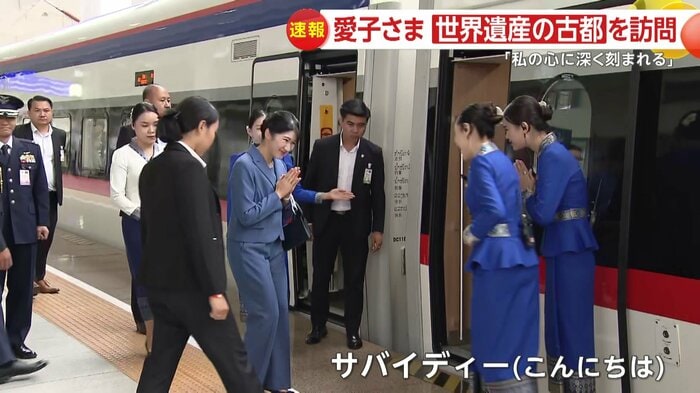 ラオスの古都ルアンパバーンに向かう高速列車に乗り込まれた、青いパンツスーツ姿の愛子さま。