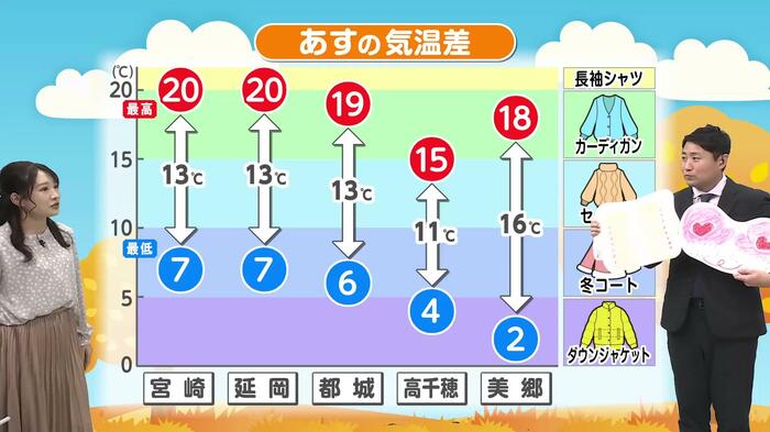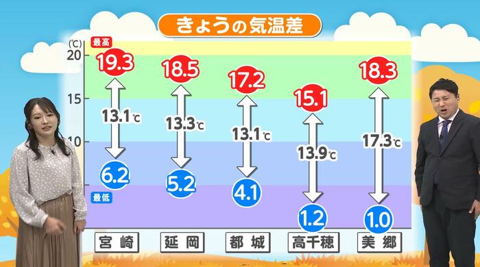 さて、この日のように朝晩はぐっと冷え込み、日中は日差しで暖かくなる日は、「寒暖差」が非常に大きくなります。実際にこの日も、美郷町では一日の気温差が17.3℃にもなりました。