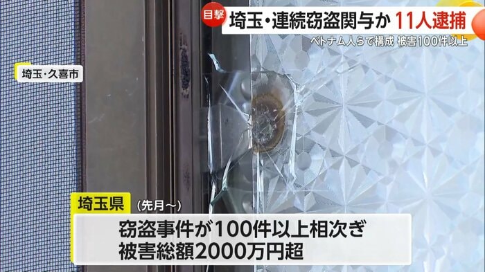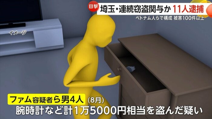 茨城・日立市で8月、空き家に侵入し腕時計などを盗んだほか、埼玉県内で続発している窃盗事件に関与した疑いでベトナム国籍の男ら計11人が逮捕された。埼玉県内では10月以降、100件以上・総額2000万円超の被害が発生。警察は東南アジア系の大規模グループとみて捜査中だ。