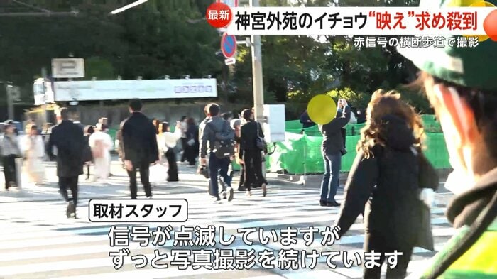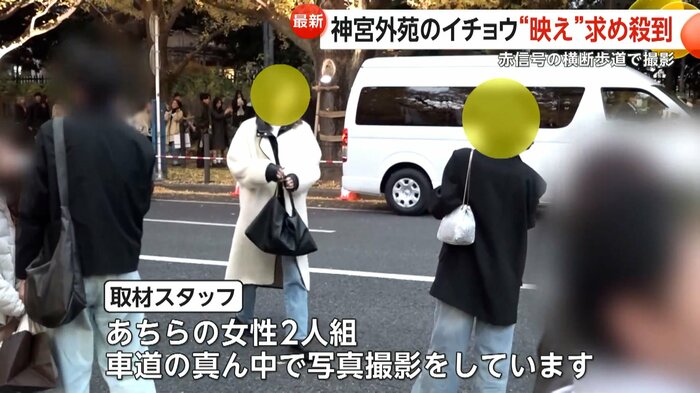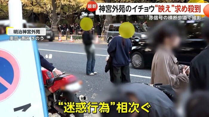 東京・明治神宮外苑では紅葉の見頃を迎えているが、多くの人が撮影のため横断歩道で立ち止まったり、車道に出て写真を撮る危険な行為が相次いでいる。一方、過去に同様の問題が起きていた六本木けやき坂では、2025年はイルミネーション開始直後から警備体制を強化し、警備員を前年の3倍に増員した。