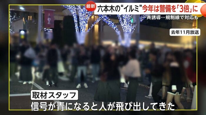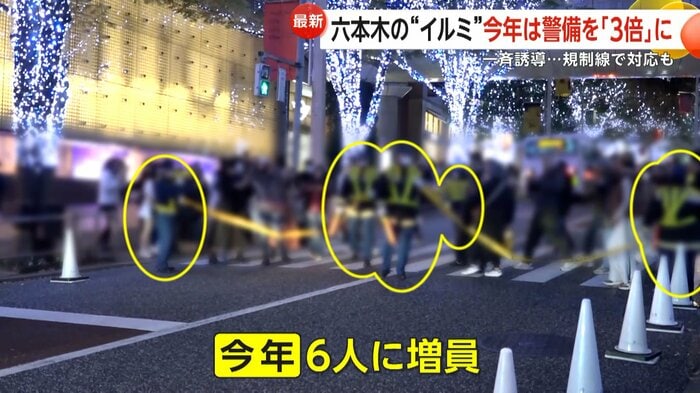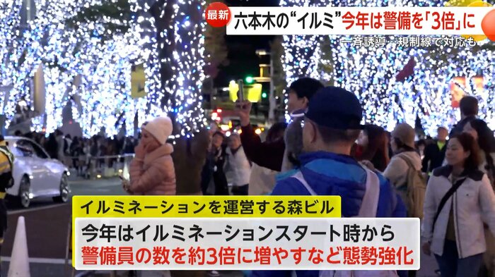 イルミネーションを運営する森ビルによると、年々混雑する時期が早まってきているため、2025年はイルミネーションスタート時から警備態勢を強化し、警備員の数を約3倍に増やしているという。