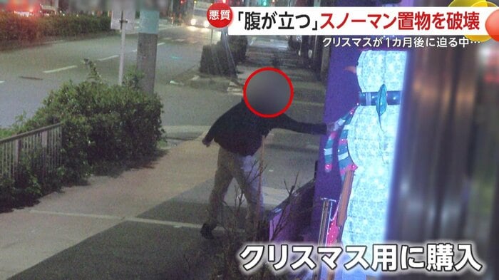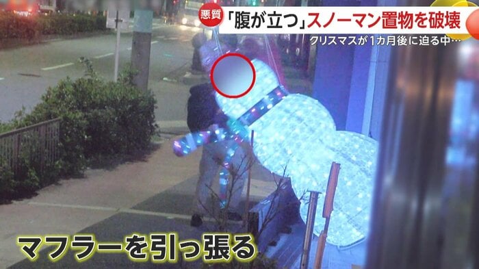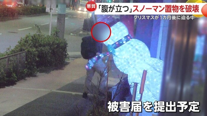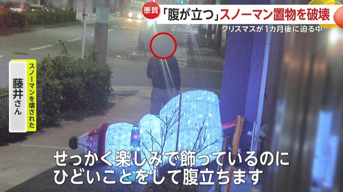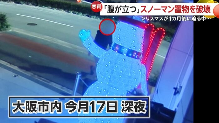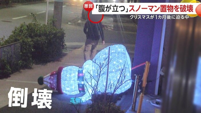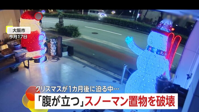 11月17日の深夜の大阪市内で、家のガレージに飾られていた高さ約2.5mの「スノーマン」の置物を、何者かが倒して破壊する悪質な行為をカメラが捉えた。被害者は警察に相談し、被害届を出す予定だという。