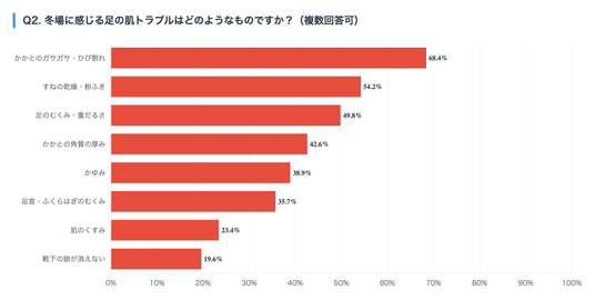 その結果、「かかとのガサガサ・ひび割れ」が68.4%で最も多く、次いで「すねの乾燥・粉ふき」(54.2%)、「足のむくみ・重だるさ」(49.8%)という結果になりました。