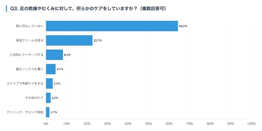 ケアをしている方の中では「保湿クリームを塗る」(22.7%)、「入浴時にマッサージする」(8.3%)、「着圧ソックスを履く」(4.7%)という結果になりました。
