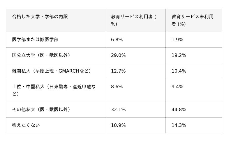 一方、教育サービス未利用者で同様の大学群に合格した割合は合計で31.5%(医学部1.9%、国公立19.2%、難関私大10.4%)に留まり、両者の間には1.5倍以上の開きが見られました。