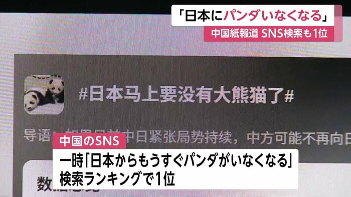 報道を受け20日、中国のSNSでは一時、「日本からもうすぐパンダがいなくなる」という言葉が検索ランキングで1位となった。