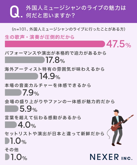 ■47.5%が、外国人ミュージシャンのライブの魅力は「生の歌声・演奏が圧倒的だから」と回答