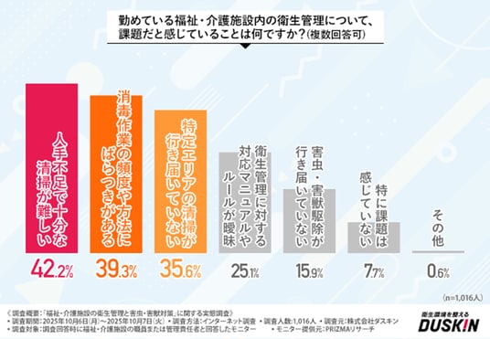 株式会社ダスキン(本社所在地:大阪府吹田市、社長:大久保裕行)が展開する、ターミニックス事業(害虫獣の駆除と総合衛生管理)は、福祉・介護施設の職員または管理責任者、1,016人を対象に「福祉・介護施設の衛生管理と害虫・害獣対策」に関する実態調査を実施しました。