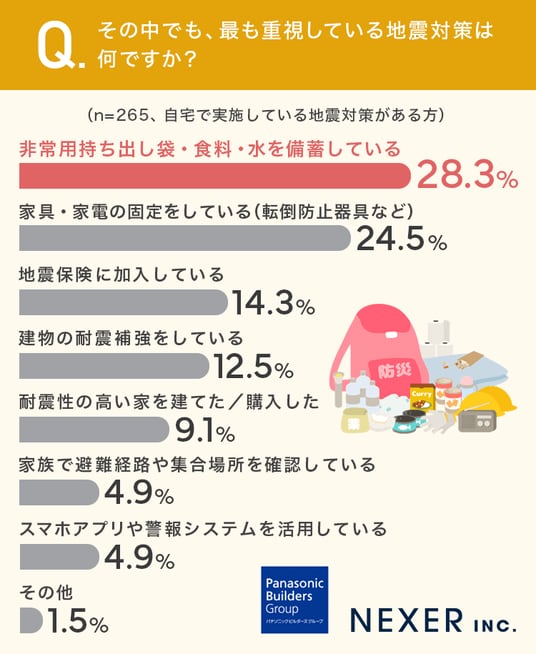 最も重視しているのは、「非常用持ち出し袋などの備蓄」と「家具・家電の固定」でした。