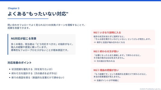 本資料では、初動フォローがうまくいかない本当の理由を「顧客の温度」ではなく対応設計の問題として整理し、商談率を高めるための“型”を実務レベルで解説しています。
