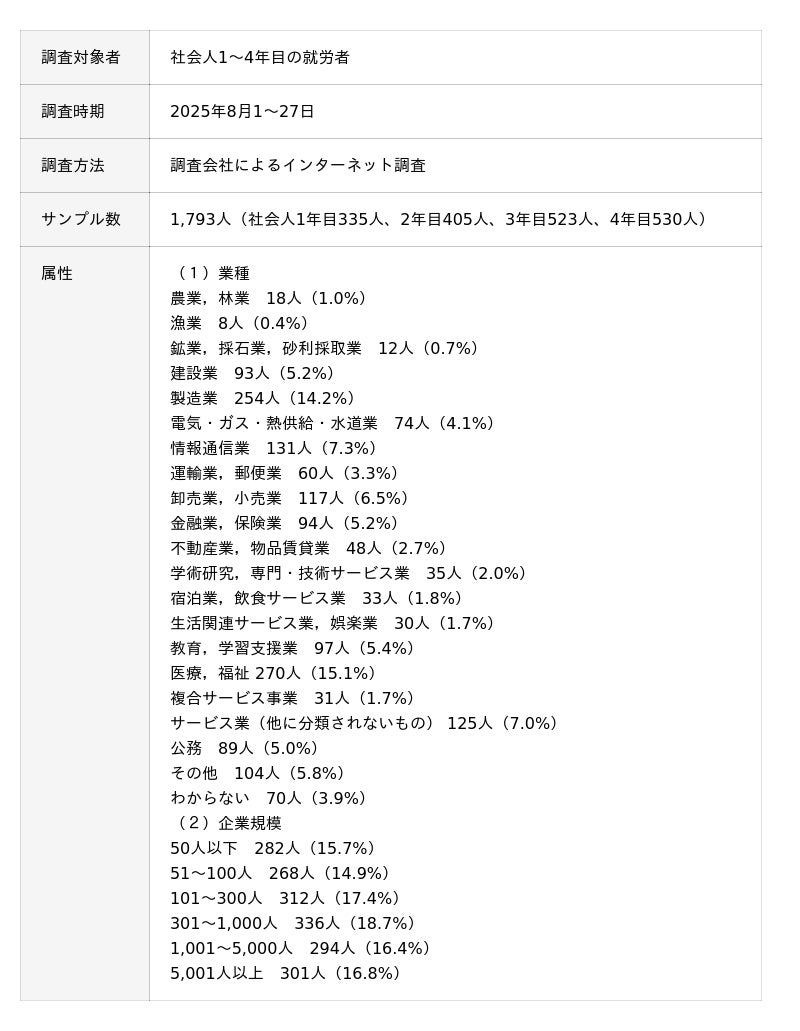 累計20,000社450万人以上の組織開発・人材育成を支援するALL DIFFERENT(オールディファレント)株式会社(所在地:東京都千代田区 代表取締役社長:眞崎大輔)および「人と組織の未来創り(R)」に関する調査・研究を行うラーニングイノベーション総合研究所(R)は、2025年8月1~27日の期間で、社会人1~4年目の若手社員1,793人に対し意識調査を実施しました。本リリースでは、若手社員の勤続意向の実態を調査・分析します。