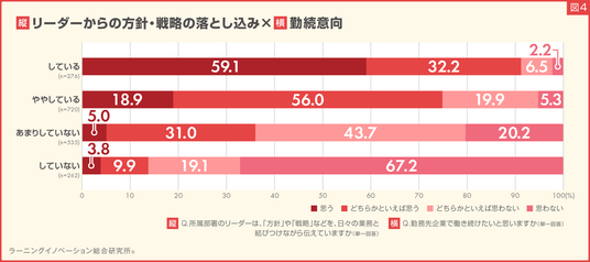 リーダーからの方針・戦略の落とし込みを「ややしている」「あまりしていない」の結果も鑑みると、方針・戦略の落とし込みと若手社員の勤続意向には、相関の関係があることがわかりました(図4)。