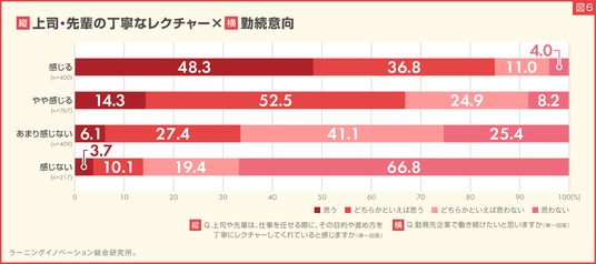 上司・先輩による丁寧なレクチャーを「やや感じる」「あまり感じない」の結果を鑑みると、丁寧なレクチャーと若手社員の勤続意向には、相関の関係があることがわかりました(図6)。