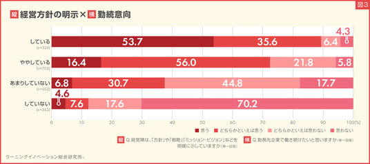 経営方針の明示を「ややしている」「あまりしていない」の結果も鑑みると、経営陣からの経営方針等の明示と、若手社員の勤続意向には、相関の関係があることがわかりました(図3)。