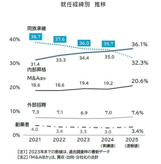 就任経緯別:「脱ファミリー」が加速 「未経験でも」登板2025年に代表者交代が行われた企業のうち、前代表者との関係性(就任経緯別)をみると、2025年(速報値)の事業承継は、血縁関係によらない役員・社員を登用した「内部昇格」によるものが36.1%となった。これまで事業承継の形式として最も多かった「同族承継」(32.3%)を速報値段階で上回った。以下、買収や出向を中心にした「M&Aほか」(20.6%)、社外の第三者を代表として迎える「外部招聘」(7.6%)など、外部から経営トップを迎え入れる事業承継が続いた。