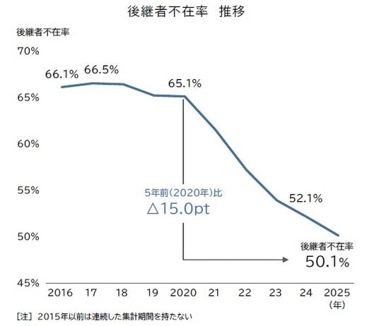 2025年における日本企業の後継者不在率は50.1%で、前年から2.0ポイント低下し、7年連続で改善傾向が続いている。官民の相談窓口や支援メニューの拡充が改善に寄与した。