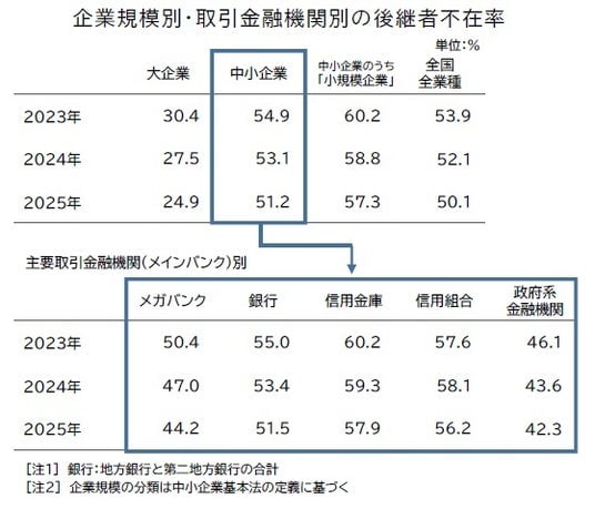 中小企業の後継者不在率を、企業の「主要取引金融機関(メインバンク)」別にみると、2025年では「メガバンク」が44.2%だったほか、事業承継支援に注力する「政府系金融機関」も42.3%と、いずれも低水準で推移した。他方、「信用金庫」(57.9%)、「信用組合」(56.2%)はいずれも全国全業種平均(50.1%)を大きく上回る水準だった。事業承継の局面では、後継者が株式や事業用資産を買い取る場合も多く、資金調達を含めた承継ノウハウのほか、承継に関心の高い企業・経営人材などを紹介するネットワークなど、金融機関の果たす役割は大きい。ただ、こうした機能を十分に提供するための専門人材やノウハウが蓄積されていない、あるいは人員不足から「事業承継支援まで手が回らない」といった金融機関では、潜在的な事業承継ニーズを掘り起こせていない可能性もある。