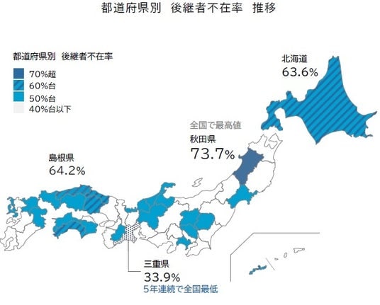 都道府県別で最も後継者不在率が低いのは「三重県」で33.9%だった。2021年以降、5年連続で全国最低水準となった。「地域金融機関などが密着して支援を行っていることに加え、経営や商圏が比較的安定している企業も多い」などの理由から、同族内で経営を引き継ぎやすい環境が整っていることなどが背景にある。同県では2018年にピークとなる69.3%を記録して以降、不在率の急激な低下がみられたものの、その後の改善幅は鈍化傾向で推移している。この他、不在率が全国平均(50.1%)を下回る都道府県は24に上った。