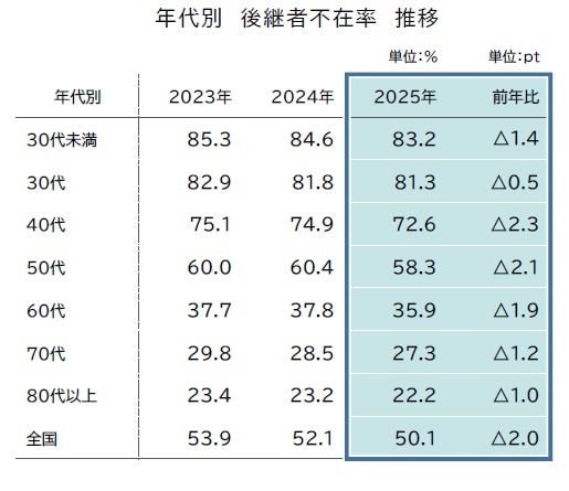 年代別:「40代・50代」で後継者不在率の大幅改善続く