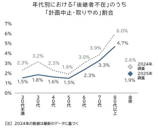 近時は経営環境の急激な変化により事業承継を中断したケースや、現代表者による後継者選びの見直し、あるいは後継者候補だった人物の辞退や退社といったケースなどもみられる。2024年→2025年の後継者策定状況が比較可能な企業で、後継者が「不在」だった約10万社の動向をみると、2024年以降に代表者交代を行ったことで後継者を決めていない「承継直後」が3.0%、2024年時点では後継者候補がいたにもかかわらず2025年に後継者不在となった「計画中止・取りやめ」が1.9%を占めた。なかでも、「計画中止・取りやめ」は前年調査(2.6%)から低下した。
