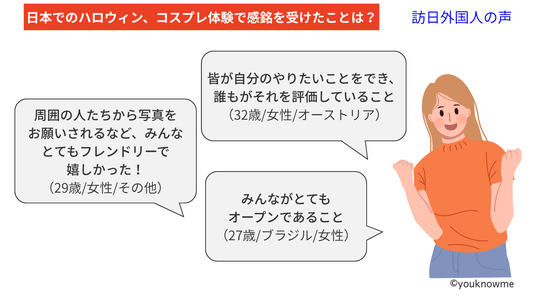 そして、日本でのハロウィンまたはコスプレ体験で最も感銘を受けたことを問う設問(フリーアンサー)では、「人々がとても親切」、「みんながフレンドリー」など“人”そのものへの感銘の声が多数挙がるとともに、単なるイベントではなく、オープンで受け入れ合う空気感に対する感動の声が多く寄せられました。
