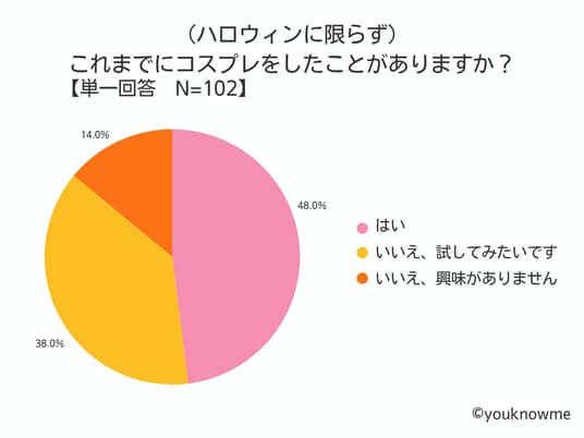 日本のハロウィンの魅力として注目が高いコスプレですが、コスプレ人気はハロウィンだけではありません。コスプレ経験について聞いてみたところ、48.0%の人が「経験がある」という結果となり、経験はないが試してみたい人も38.2%と、コスプレに対する高いモチベーションが見られます。また、コスプレ経験者に対し、実際にどのような機会でコスプレをしたかという設問(フリーアンサー)では、日本でのコスプレフェスや、各国で行われているコミコン(コミック・ブック・コンベンション)という声が見られました。