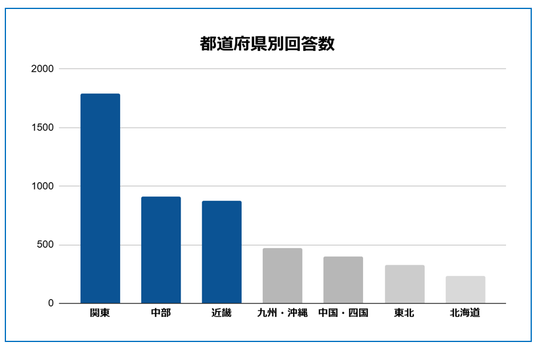 主な回答地域は「関東(約1,700名)」「中部(約900名)」「近畿(約900名)」が半数以上を占めたが、地域による回答傾向に大きな差は見られなかった。