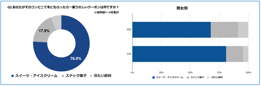 スイーツ・アイスクリームが76.0%で圧倒的1位 となった。冬の時期であっても、「気分が上がる」「ご褒美として嬉しい」という気持ちに結び付きやすいカテゴリであり、年代を問わず幅広く支持されていることが特徴だった。