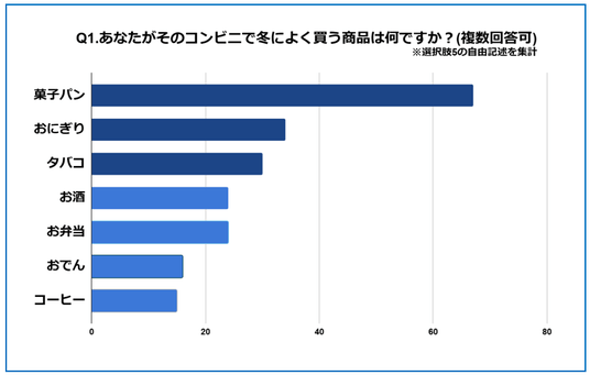 また、自由回答214件を精査したところ、選択式では見えづらかった日常の買い物習慣も浮かび上がってきた。最も多いのは 菓子パン(67件) で、冬に限らず手軽な食事の手段としてコンビニを利用する人が多いことが分かった。