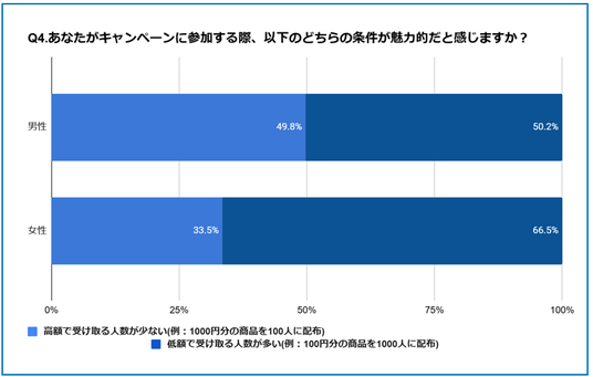 また、キャンペーン形式については「低額×大人数」が全体の支持を集め、特に女性でその傾向が強かった。年代による違いは小さく、性別の価値観の差が最も表れた設問となった。