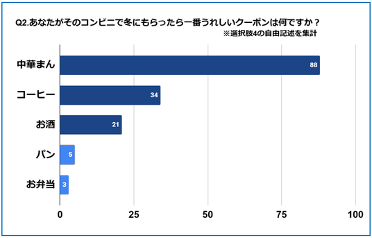 最も多いのは中華まん(88件)で、冬季ならではの「もらったら嬉しい季節性商品」として支持が大きい。選択式ではカテゴリ化されていないため、自由回答が本来の「冬のリアルな嬉しさ」を補完している形といえる。