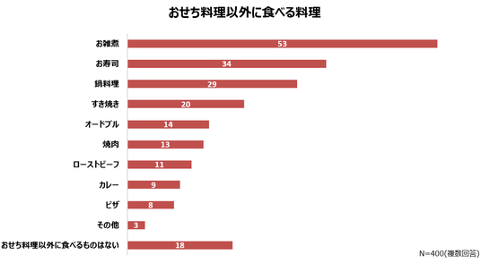 おせち料理以外に食べる料理について、1位「お雑煮」(53%)、2位「お寿司」(34%)、3位「鍋料理」(29%)という結果になりました。お正月らしいごちそうとしてお寿司やローストビーフから家族みんなが楽しめるメニューであるカレーやピザがランクインしました。