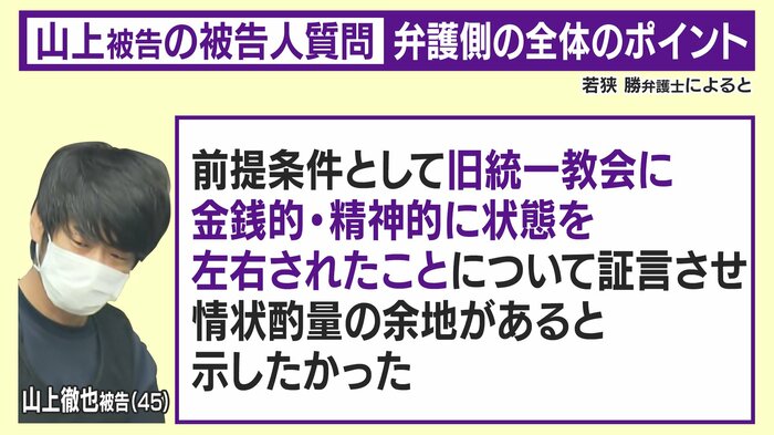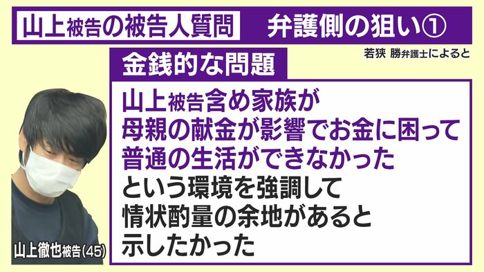 20日の被告人質問における、弁護人のスタンスは2つ軸足があったと思うんです。1つは、財産的、金銭的に山上被告が相当追い込まれていったというところ。もう1つは精神的にも相当追い込まれていったというところ。財産的、金銭的な面においては、山上被告含め家族が母親の献金が影響でお金に困って普通の生活ができなかったという環境を強調して、情状酌量の余地があると裁判員に訴えるという形になっていたと思います。