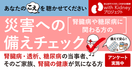 腎臓病や糖尿病をもつ方、そのご家族、腎臓の健康が気になる方などを対象に、防災への備えや意識を、50項目でセルフチェックできる形式のアンケートを実施します。