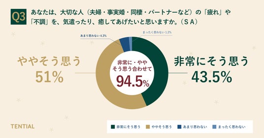 大切な人の「疲れ」や「不調」に対し、気遣いや癒やしを届けたいかという問いには、「非常にそう思う(43.5%)」、「ややそう思う(51.0%)」という回答が集まりました。 これらを合わせると94.5%に達し、ほとんどの方が「大切な人を労ってあげたい」という強い意向を持っていることが明らかになりました。パートナーの不調をただ見守るだけでなく、何らかの形でサポートしたいという優しさが数値に表れています。