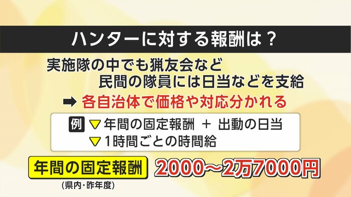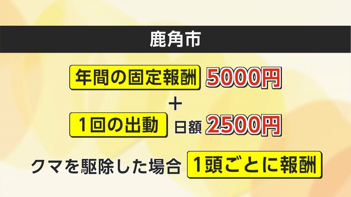 クマの出没が多い鹿角市では、隊員に年間5000円の固定報酬が支払われる。出動1回につき2500円が加算され、さらに駆除した場合は1頭につきチームに1万円が支給される。