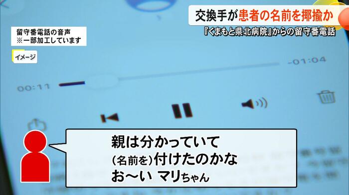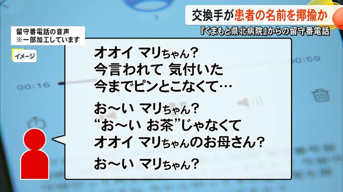 これは11月18日午後に熊本・玉名市にある『くまもと県北病院』から患者の留守番電話に残された音声。患者の実際の氏名は『オオイマリ』ではなく、一部異なっているが、まるで人の氏名を揶揄するような、約2分間の音声が記録されていた。