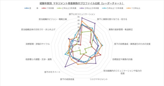 マネジメント経験年数別で得意業務のプロファイル比較 経験5年以上でバランスが良くなる傾向
