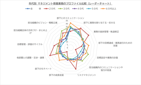 年代別_マネジメント得意業務のプロファイル比較 もっともバランスが良いのは30代