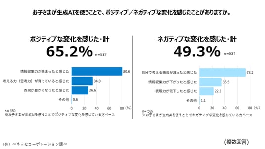 生成AI利用についての効果実感においては、プラスとマイナスが同時に現れる“二面性”が明らかになりました。65.2%の保護者がポジティブな変化を感じ、「情報収集力が高まったと感じた」や「考える力(思考力)が育っていると感じた」が挙がる一方、49.3%の保護者が「自分で考える機会が減ったと感じた」などネガティブな変化を感じています。