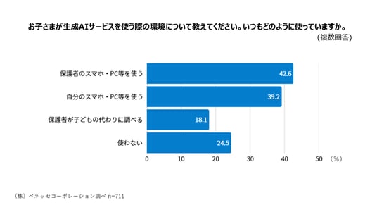 家庭における生成AIの利用環境を尋ねたところ、最も多いのは「保護者のスマホやPCなどのデバイスを使って子ども自身が使う」で、子どもが「自分のスマホ・PCなどのデバイスを使って自分で使う」が続き、「保護者が子どもの代わりに調べる」は2割弱にとどまりました。家庭では「自分で使わせる」スタイルが主流で、その中でも親のデバイスを貸与するケースが最多であることが分かりました。