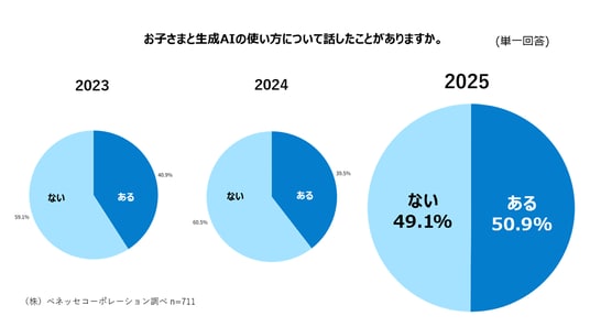 「生成AIの使い方について話したことがある」家庭は約5割とどまり、2023年の調査の約4割という結果と比較して十分に進んでいないということが明らかになりました。