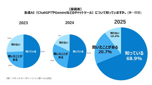 生成AIの認知について、保護者は2023年の74.1%から2025年には89.6%、小学生は47.8%から74.7%へ。ほとんどの家庭が「生成AIという言葉は知っている」という状況になっています。