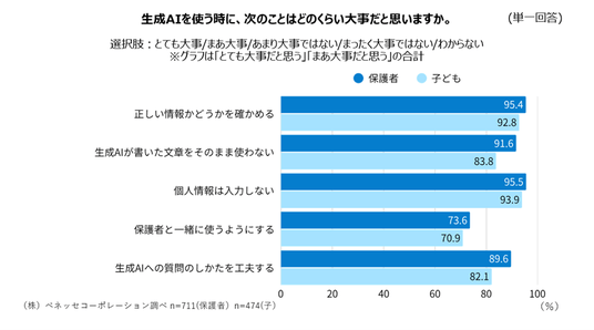 株式会社ベネッセコーポレーション(本社:岡山県岡山市、代表取締役会長兼社長:岩瀬大輔)は、全国の小学3年生から小学6年生とその保護者1,032組に、ChatGPTなどの生成AIの認知、利用経験や今後の利用意向、利用する上で大事だと思うことなどについてアンケート調査を実施しました。