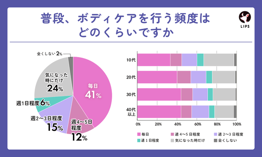 ボディケアを「毎日行なっている」と答えたのが全体で41%ほど、世代ごとの調査でも各世代50%を満たない数値でした。昨年行ったLIPS laboの調査では「毎日行なっている」と答えたのが51%と、今年は10%ほど下がる結果に。