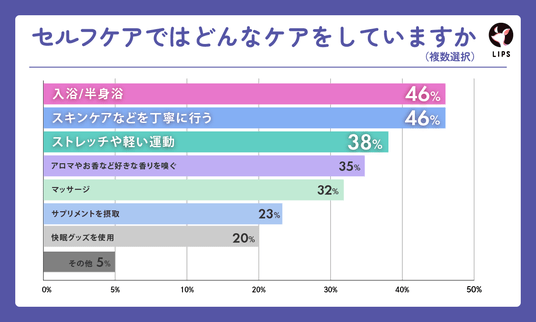 上位の回答は「入浴/半身浴・・・46%」、「スキンケアなどを丁寧に行う・・・46%」「ストレッチや軽い運動・・・38%」となりました。