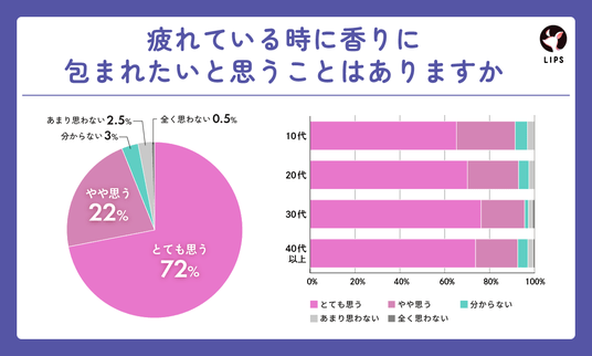 疲れている時に香りに包まれたいと答えた人は、全体で70%以上