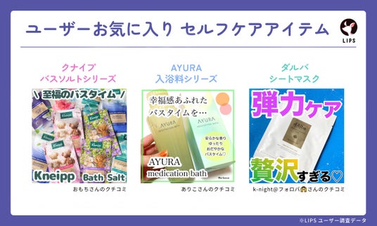 みんなの推しセルフケアアイテム調査では、『クナイプ』のバスソルト、『AYURA』の入浴料シリーズ、『ダルバ』のシートマスクを挙げる人が多数となりました。