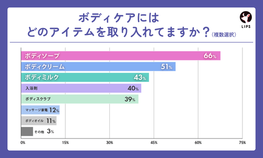 使用しているボディケアアイテムでは「ボディソープ・・・66%」がもっとも多く、アウトバスケアでは「ボディクリーム・・・51%」「ボディミルク・・・43%」人気が高い結果に。「ボディオイル」は少数派となっており、保湿はしたいけれど軽い仕上がり感が求められていると考えられます。